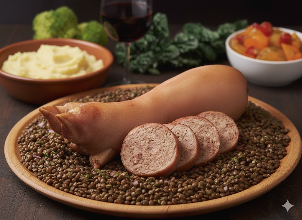 Yet Capodanno is not all explosive mayhem – it’s also a time of family, food and superstition-laced ritual. The celebrations typically begin at home with “il cenone,” the New Year’s Eve feast. Across Italy, families and friends gather for a lavish dinner that can stretch for hours issimoissimo.com. Certain dishes are virtually obligatory. At the stroke of midnight, Italians “wolf down as many lentils as they can” wantedinrome.com. These coin-shaped legumes are believed to ensure prosperity in the coming year – each lentil foretells a coin in your pocket. The tradition dates back to ancient Rome, when people gifted pouches of lentils hoping they’d turn into gold italia.it. To double down on the luck, the lentils are usually served with cotechino (a hearty spiced pork sausage) or its cousin zampone (stuffed pig’s trotter). Pork’s richness symbolizes abundance and progress, making this pairing a “double helping of fortune” on the New Year table wantedinrome.com.
