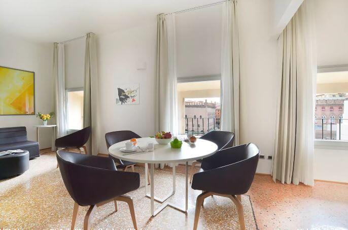This apartment is located in the heart of Bologna city to the east of side of Piazza Maggiore. It is found on the fourth floor suited with an elevator from Mezzanine beside San Petronio Basilica. The building was put up in 1412 but was fully renovated in 2010. By August 2014 the building had been refurbished to match a 5-start apartment.