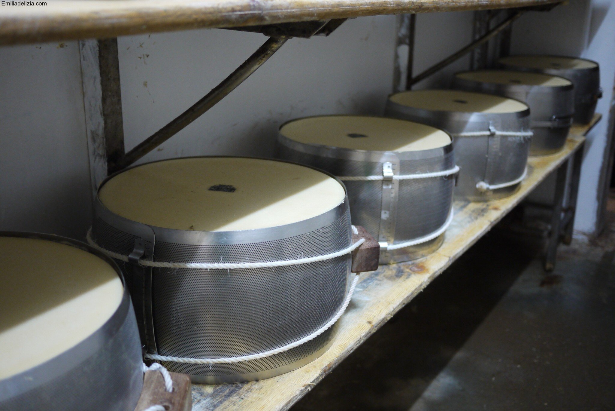 The cheese goes into the metal mould for another day. These moulds have the shape of the wheel which will not required further manipulation such as the trimming of the edges. The cheese always rest on wooden shelves which allow breathing and the correct ageing.